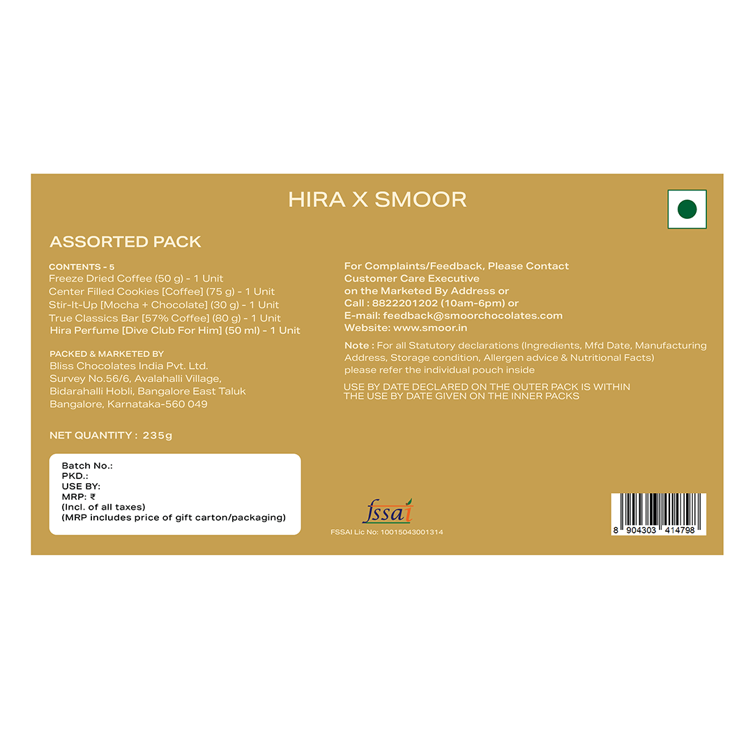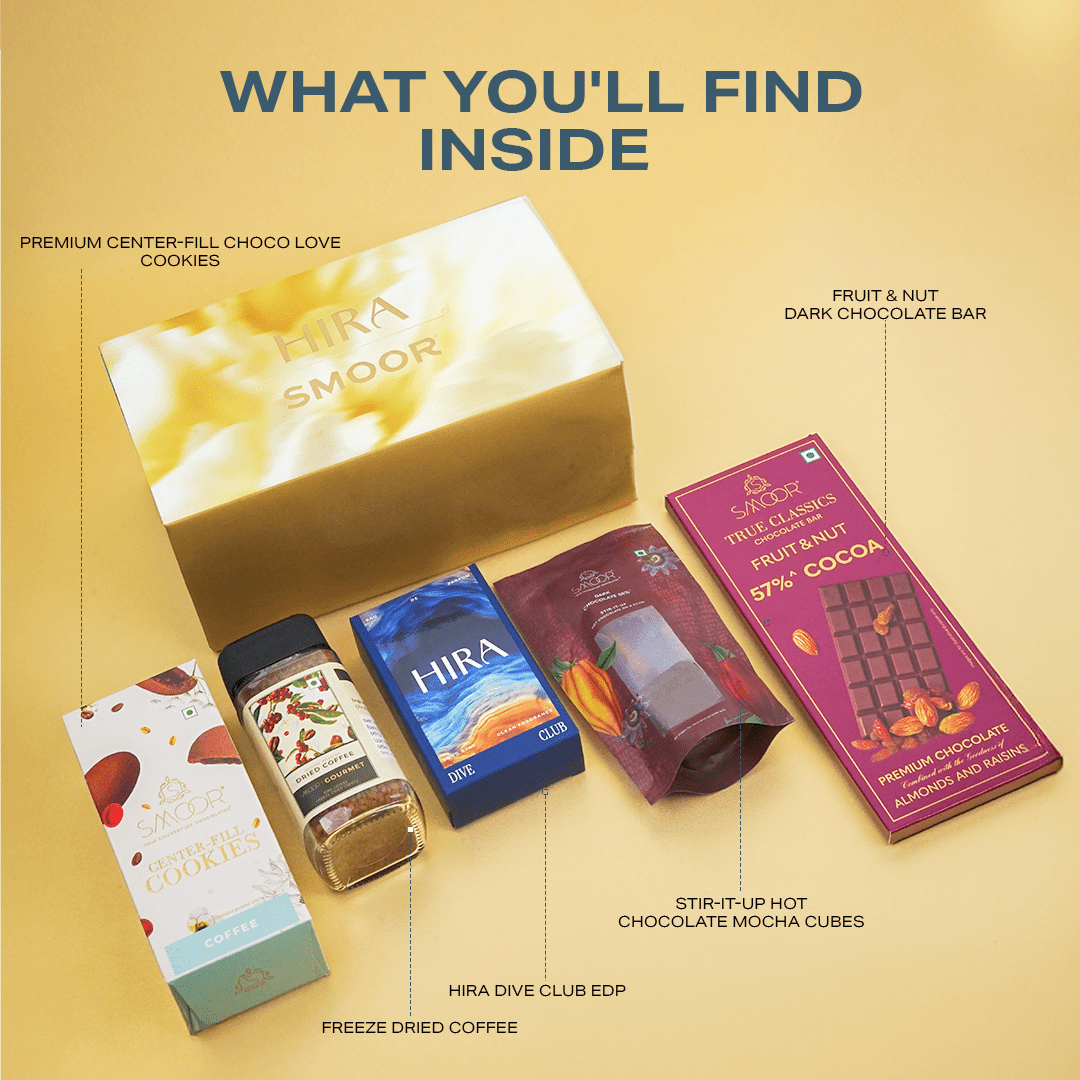 Step into confidence with HIRA Dive Club X SMOOR Perfume Gift Hamper — a bold, modern fragrance paired with indulgent gourmet treats. Dive Club’s long-lasting woody, musky and spicy notes define sophistication, making it the perfect signature scent for work, travel, or evenings out. This luxurious hamper includes Dive Club Eau de Parfum alongside Smoor’s chocofill cookies, premium coffee stir-it-up sticks, fresh coffee beans and rich 57% Fruit & nut cocoa. Thoughtfully curated and elegantly packed, it’s an exceptional gifting option for birthdays, anniversaries, festive occasions or simply to celebrate someone special.