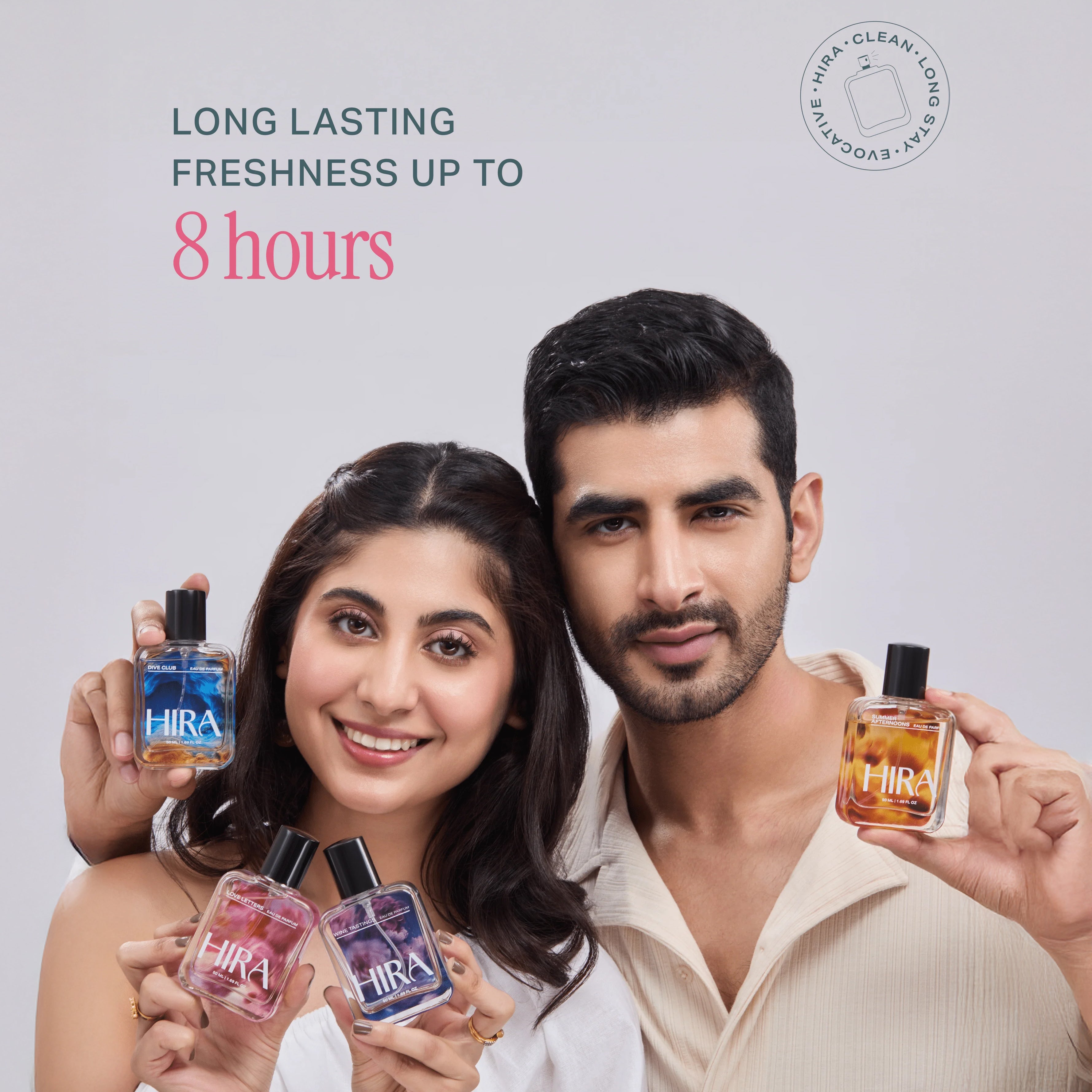 Indulge in the luxurious Hira Fragrance Collection, a curated range designed to evoke unforgettable moments through scent. Discover Hira Wine Tastings, a bold spicy oriental blend infused with rich spices and florals; Hira Summer Afternoons, a refreshing citrus oriental featuring zesty citrus and soft floral notes; Hira Love Letters, a romantic fruity floral mix with sweet fruits and delicate blooms; and Hira Dive Club, a deep woody aromatic fragrance combining earthy woods and fresh herbs.